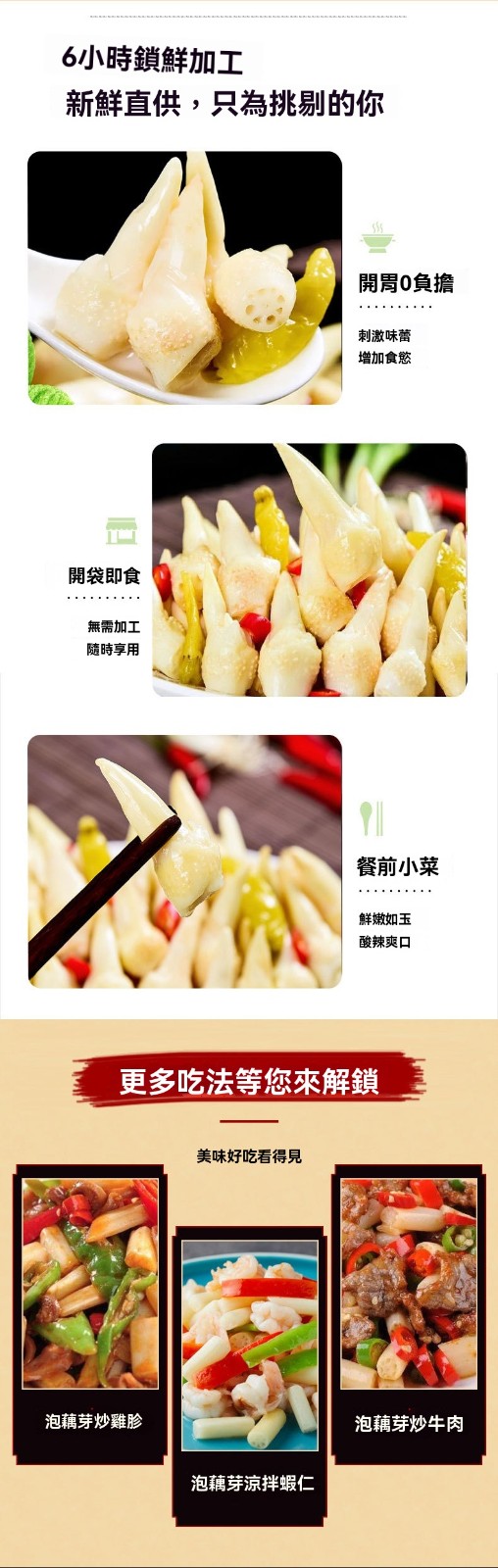 4分鐘前【白河藕芽】開胃小菜,酸辣爽口,特色口味,選用優質藕芽製作,炒菜、拌麵非常脆嫩 - 【今日限定 買二發三】3入組 NT$998