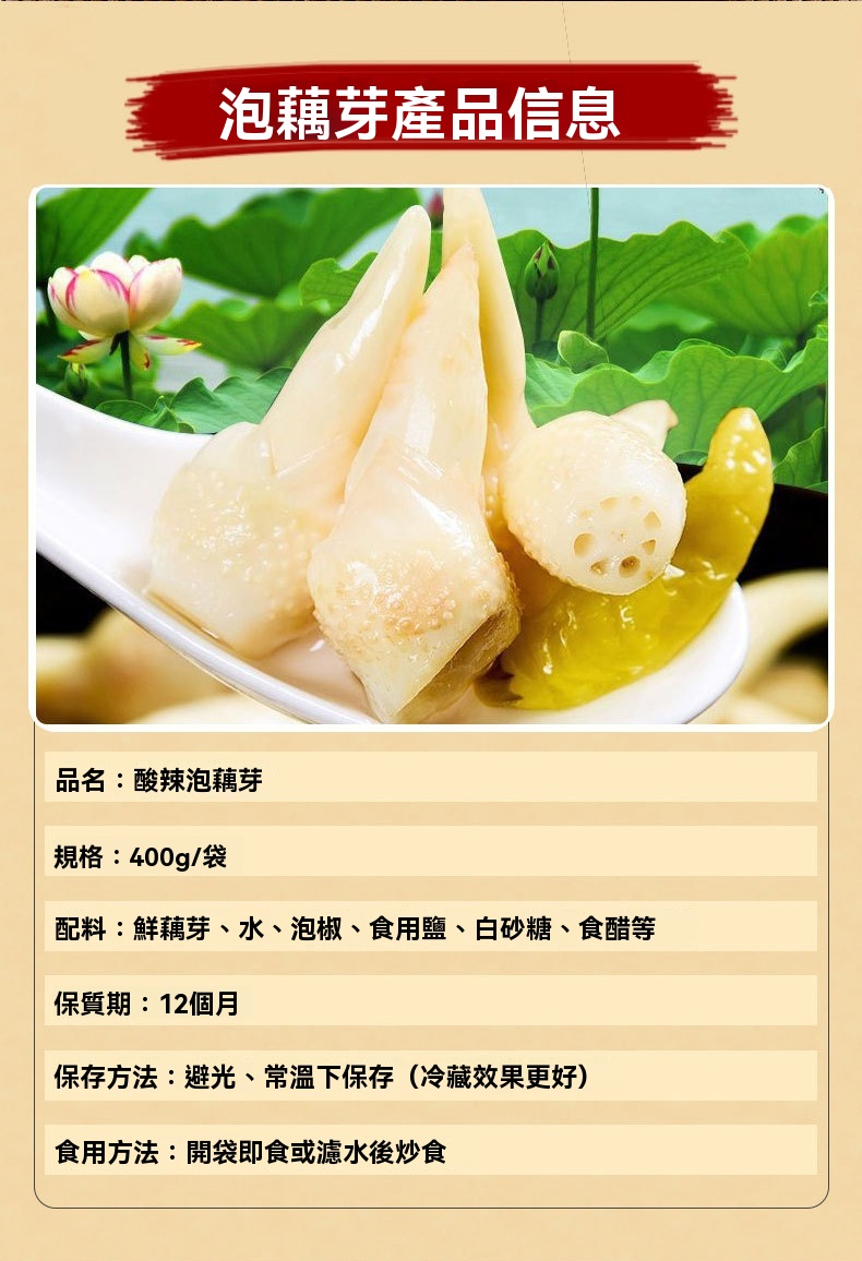 15分鐘前【白河藕芽】開胃小菜,酸辣爽口,特色口味,選用優質藕芽製作,炒菜、拌麵非常脆嫩 - 【破盤下殺 囤貨必選 買四發五】5入組 NT$1398